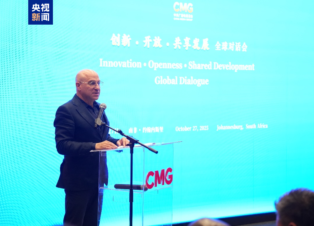 当地时间10月27日,由中国中央广播电视总台主办的“创新·开放·共享发展”全球对话会南非专场在约翰内斯堡举行。中宣部副部长、中央广播电视总台台长慎海雄,南非科技与创新部长布莱德·恩齐曼迪作视频致辞。中国驻南非大使吴鹏、南非国际关系与合作部副部长阿尔文·博特斯、约翰内斯堡大学副校长帕斯瓦纳·玛夫亚、南非国会议员西利兹·孟亚、金砖国家工商理事会代表斯塔夫罗斯·尼古劳出席活动并致辞。来自中南两国政界、经济界、文化界、学界、媒体等百余位嘉宾围绕中国扩大高水平对外开放,与世界携手构建繁荣未来等话题展开深入交流。